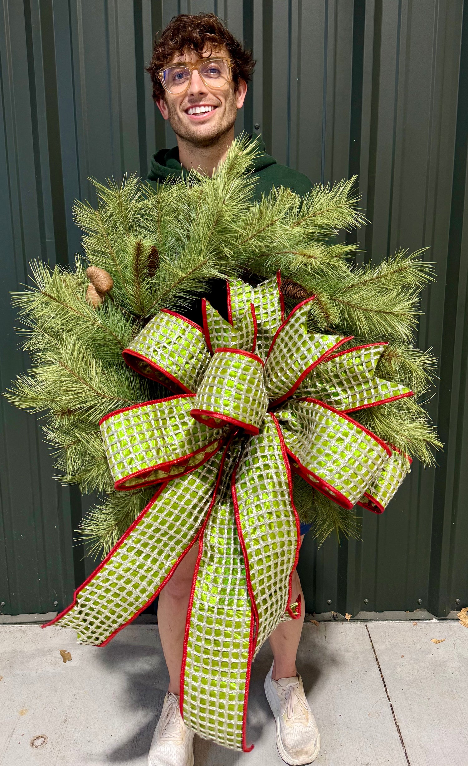 24 inch lush PINE wreath paired with a JME handtied bow.