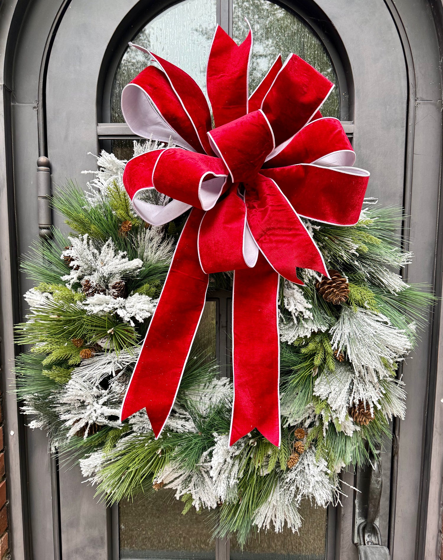 Big Flocked mixed foliage wreath with a JME hand tied bow in it. Red velvet backed with white taffeta. 36inches wide