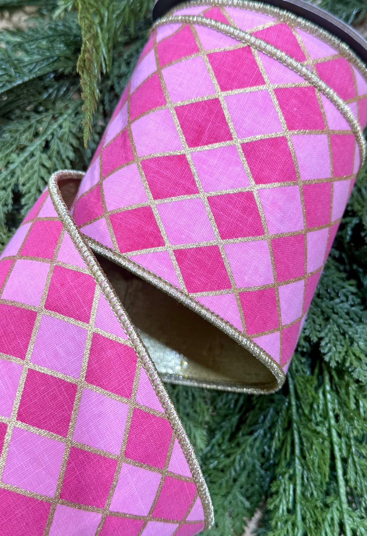 Diamond harlequin pink and dark pink with a gold backing. 5 yards x 4”