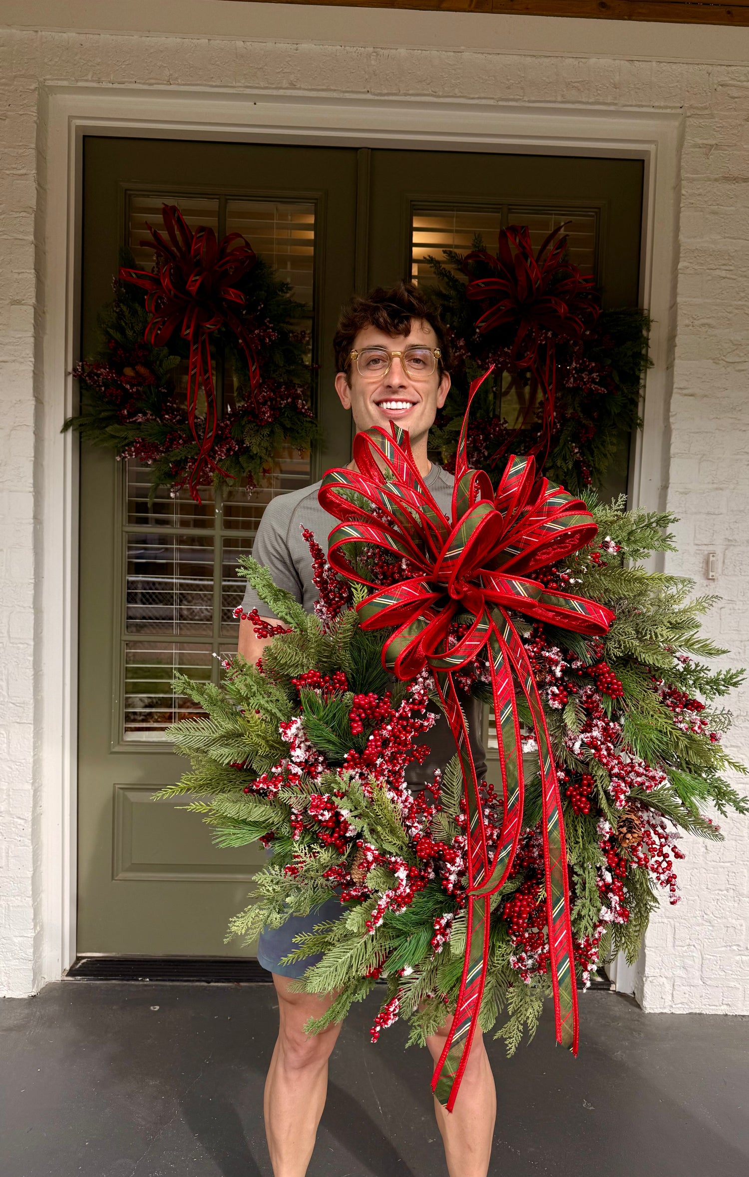 Faux Mixed berry wreath made by JME with a bias plaid hand tie JME bow. About 24 inches wide.