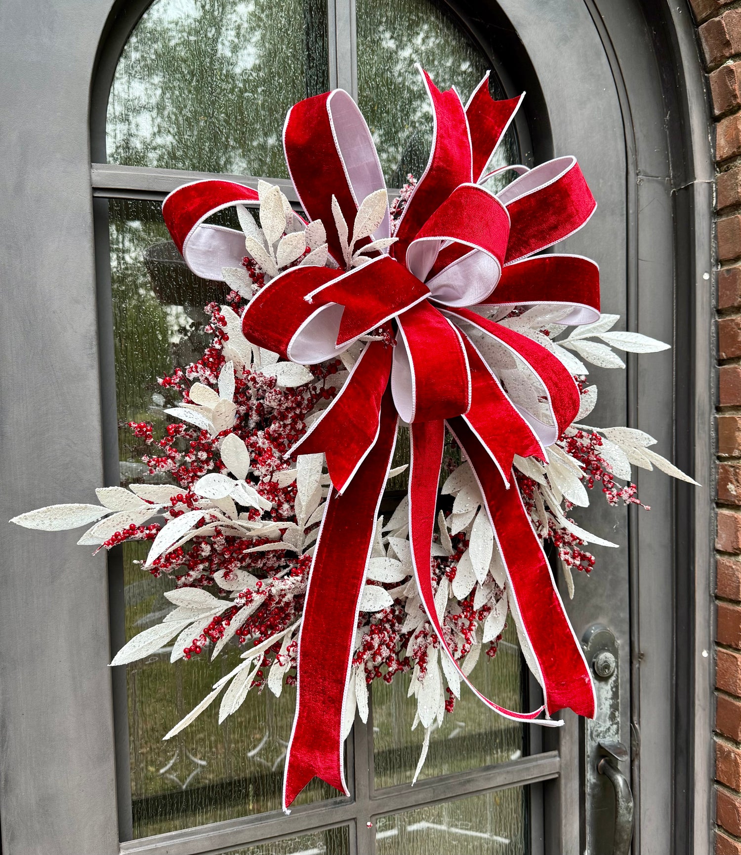 Handmade JME wreath. White icy bay leaves, and icy berries. with a hand tied JME red velvet bow. About 24 inches wide.