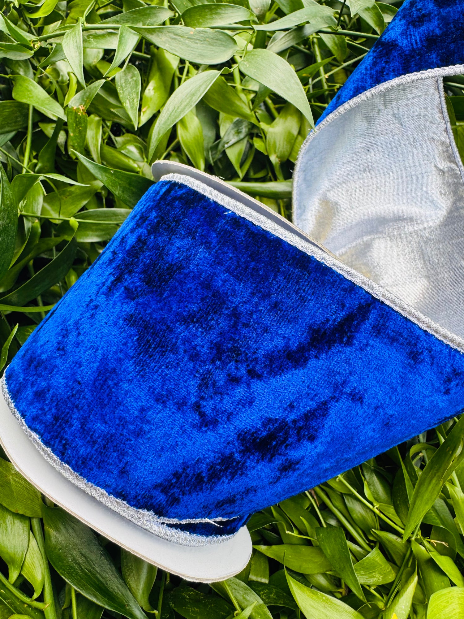 JME heavy wired ribbon. Blue velvet with Silver metallic back. 4” x 10 yards.
