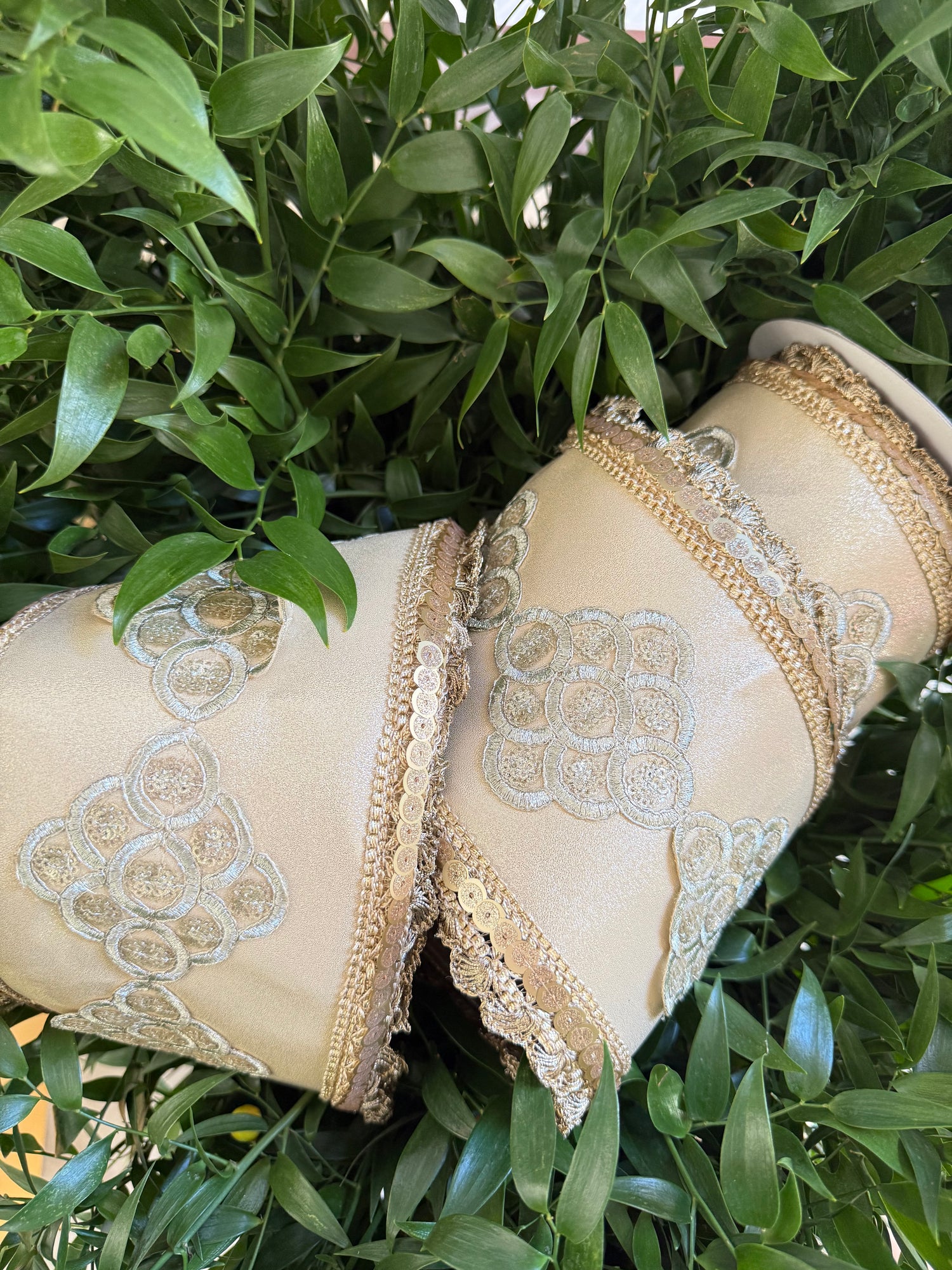JME heavy wired ribbon. CHAMPAGNE Metallic Sequin Band with Scalloped Edge 6"x 5YDS