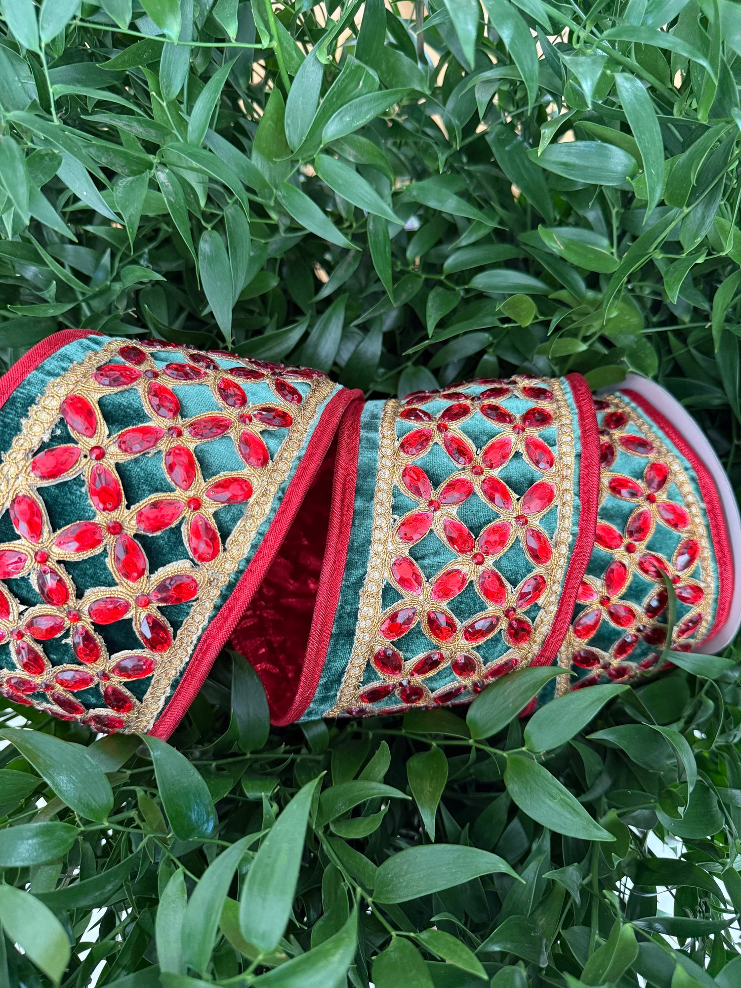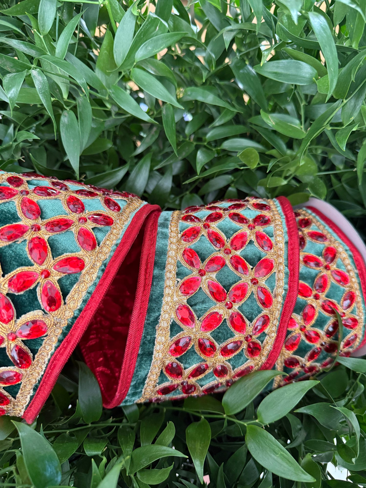 JME heavy wired ribbon. DARK GREEN Velvet with Red Jeweled Band and Metallic Back 4"x 5YDS