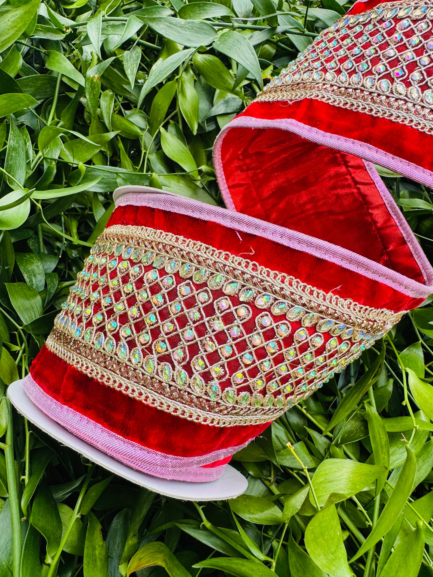 JME heavy wired ribbon double fused, Red velvet with jeweled band and Pink piping with Red dupion metallic back 4"x 5yds