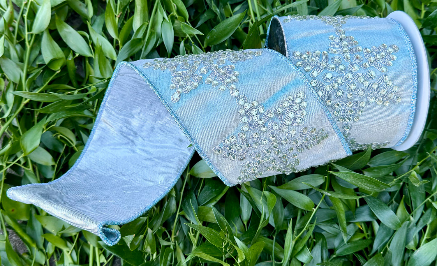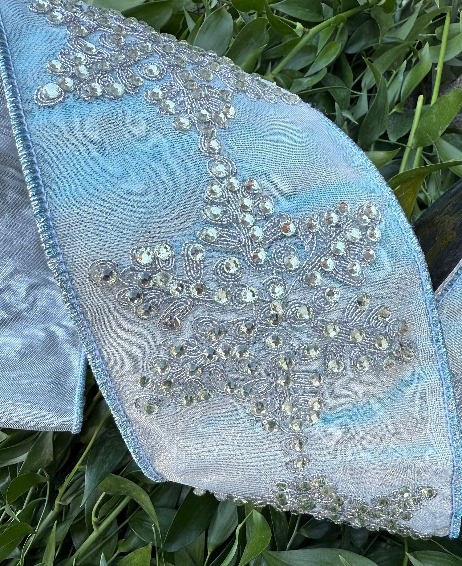 JME heavy wired ribbon. Jeweled snowflake on metallic blue. Backed with silver dupion. 4” x 5 yards.