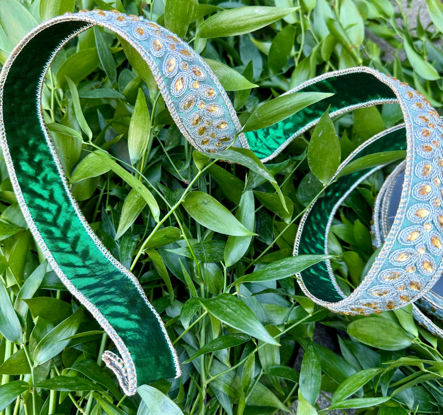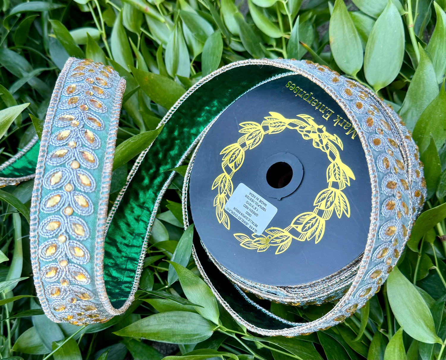 JME heavy wired ribbon. Metallic DARK GREEN with Jeweled leaf band. 1.5“ x 10 yards.