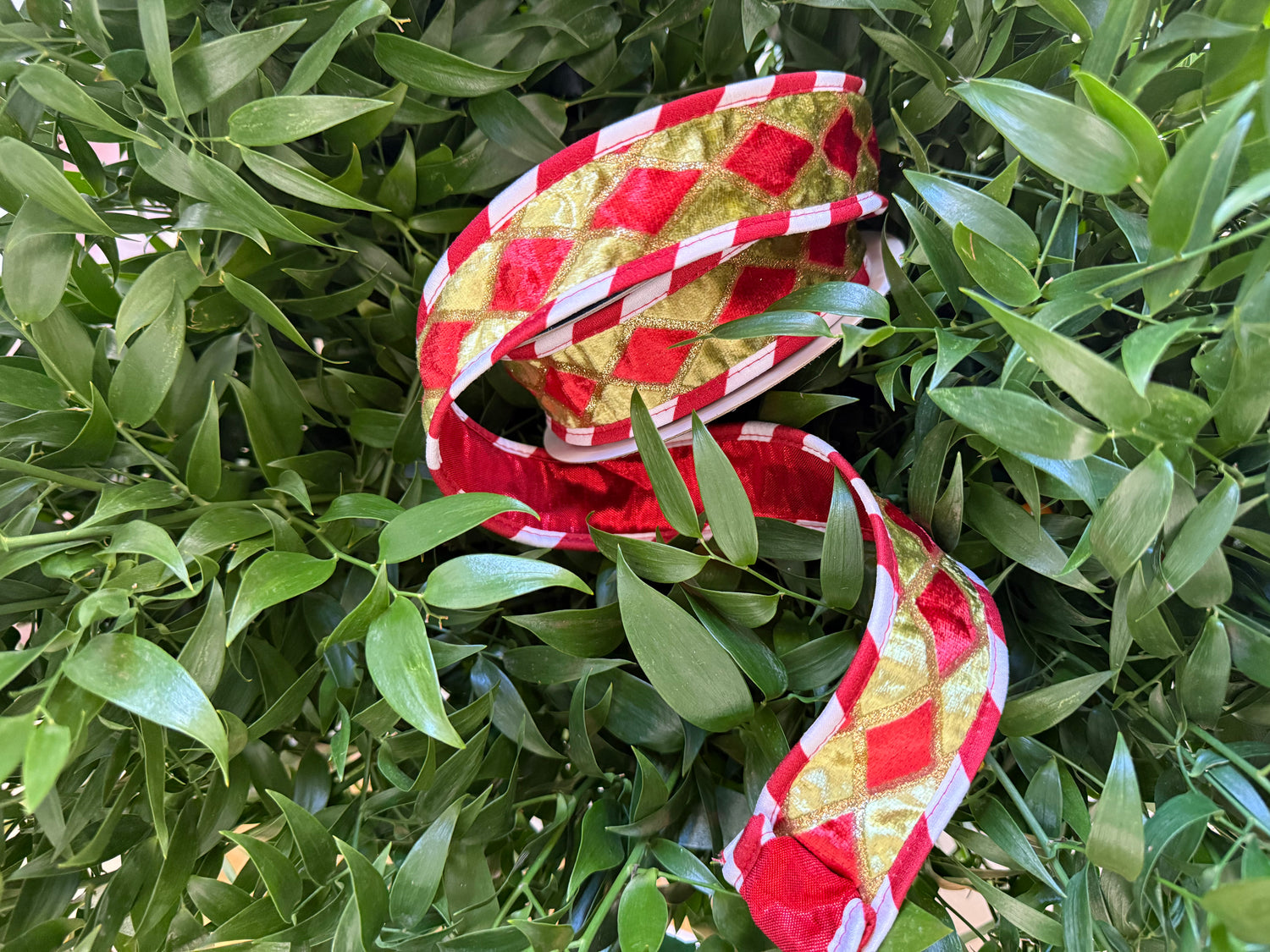 JME heavy wired ribbon. RED/LIME Harlequin with Red/White Edge and Red Metallic Back 1.5"x 10YDS