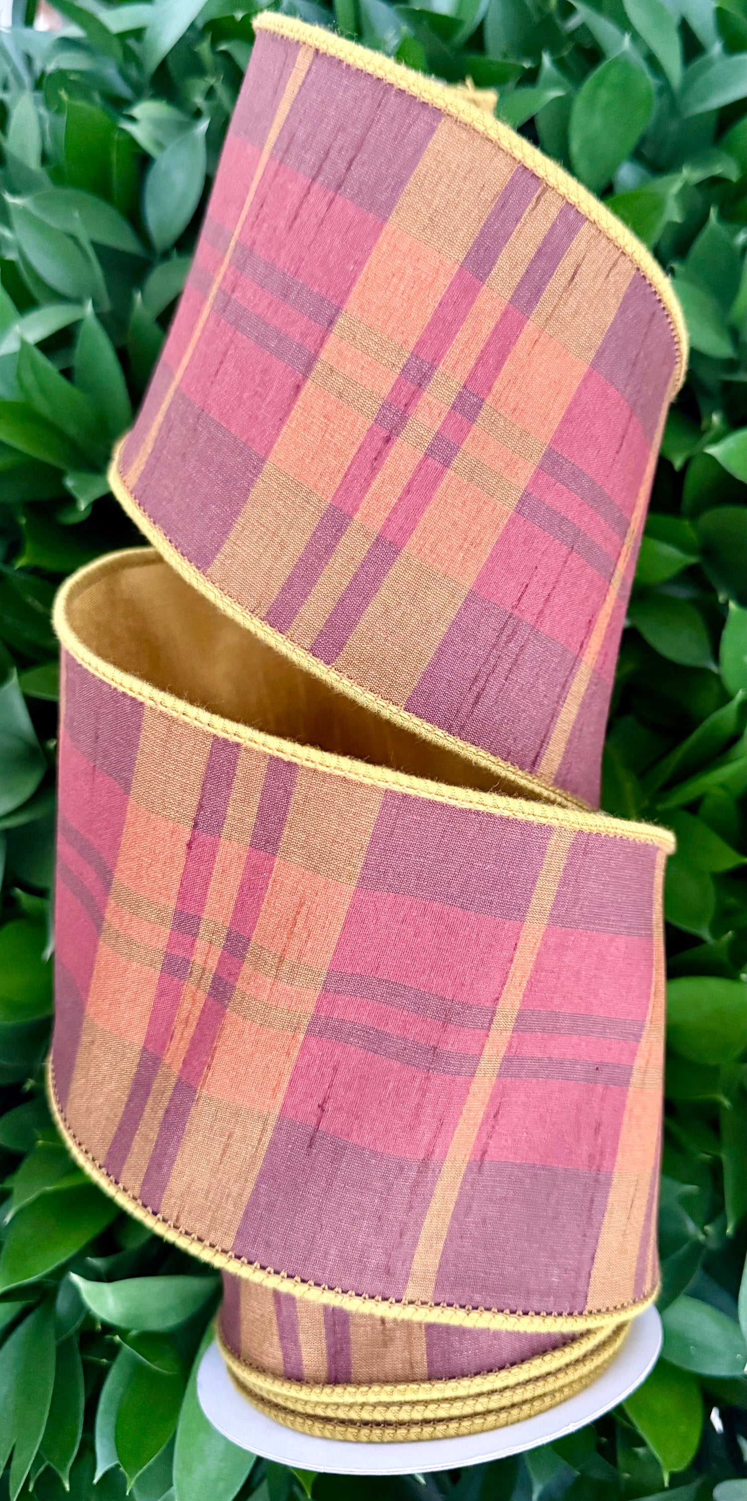 JME heavy wired ribbon. RUST/BROWN Plaid with Dupion Back