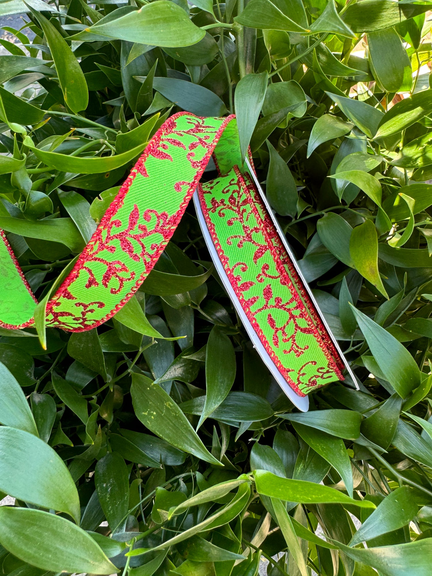 Red Glitter Acanthus Leaf on Green Wired Ribbon 5/8"x 10YDS