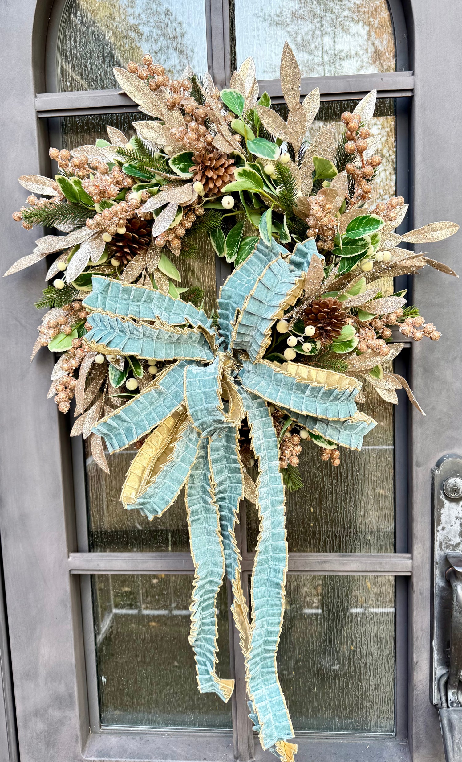 Winter blues wreath. Handmade by JME paired with a JME handtied ruffle bow. About 24inches wide.