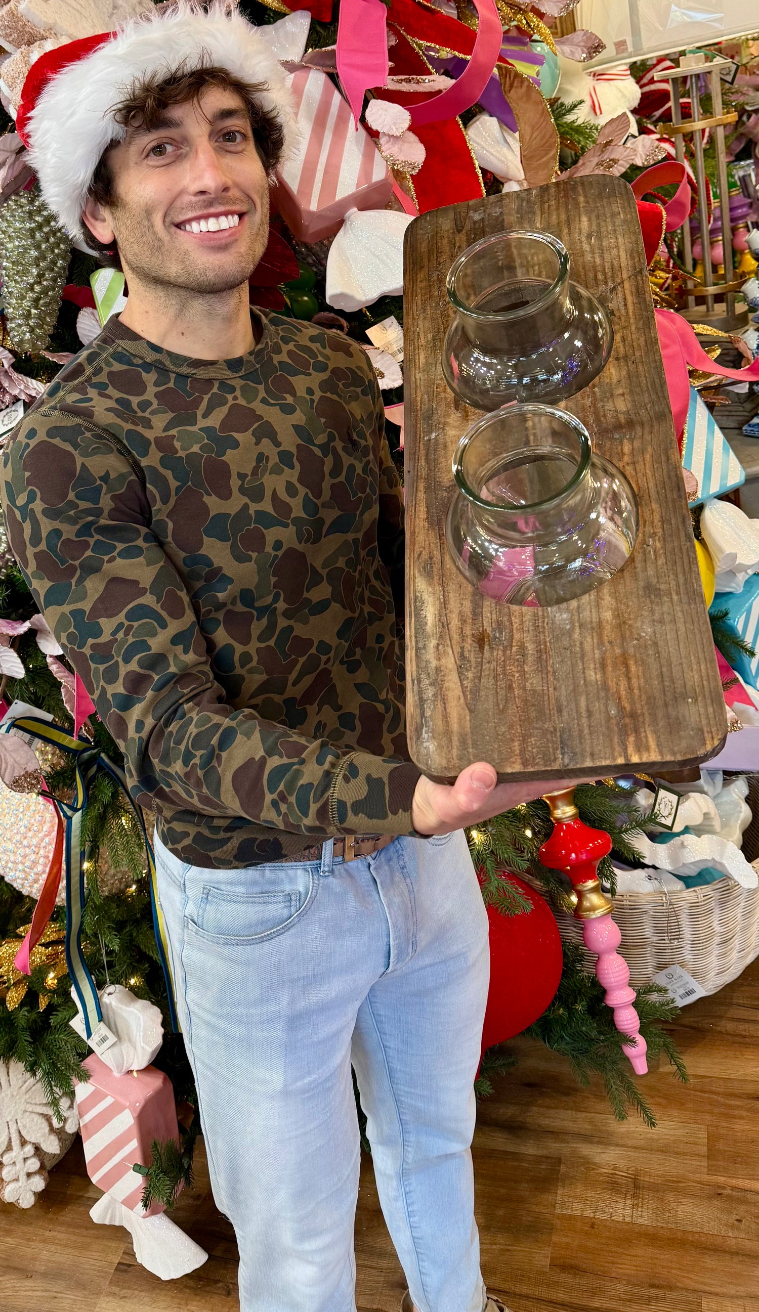 Wooden Flower Stand with Two Glass Bottles. Flowers not included.